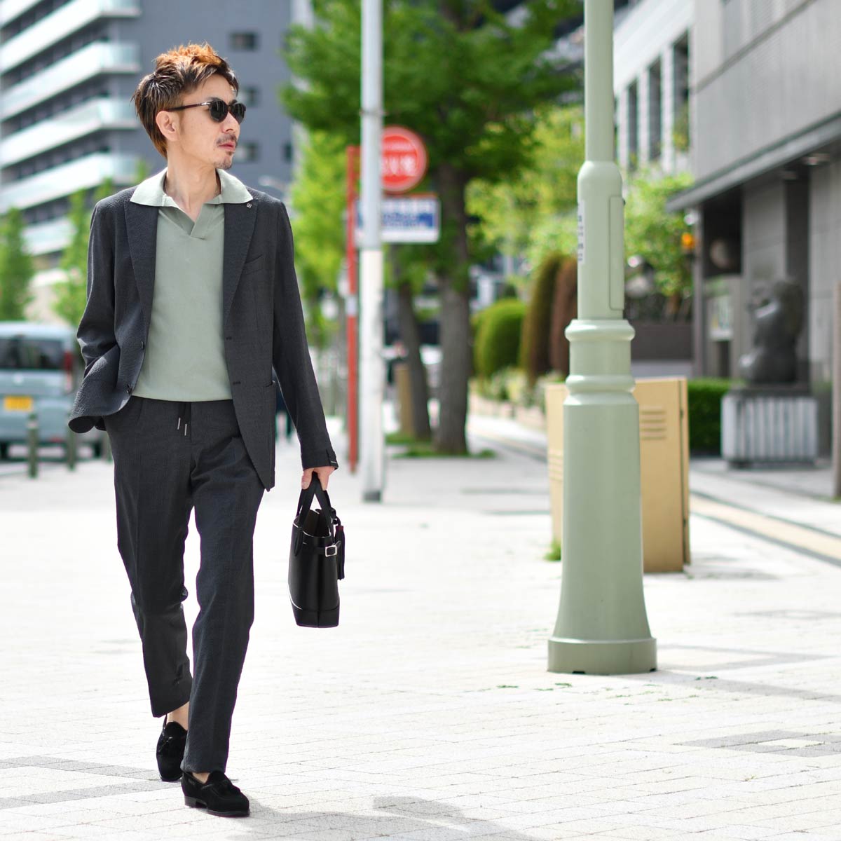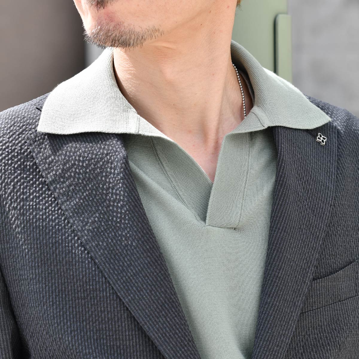 無機質になりがちなモノトーンスタイルに、柔らかなグリーンのニットポロをインナーとしてセレクト。