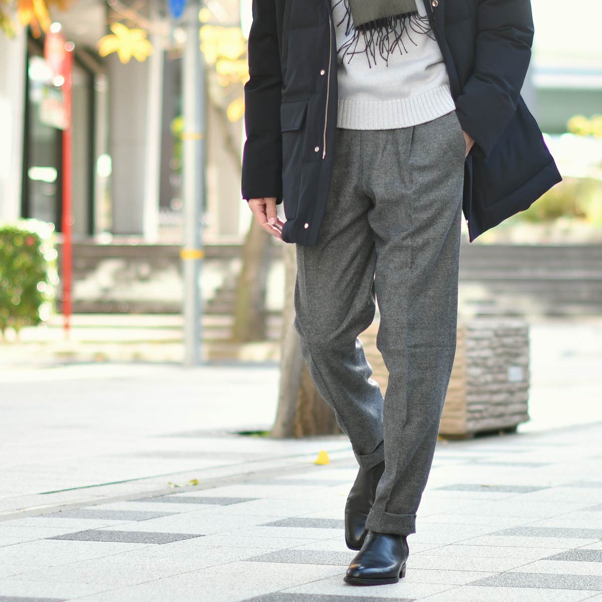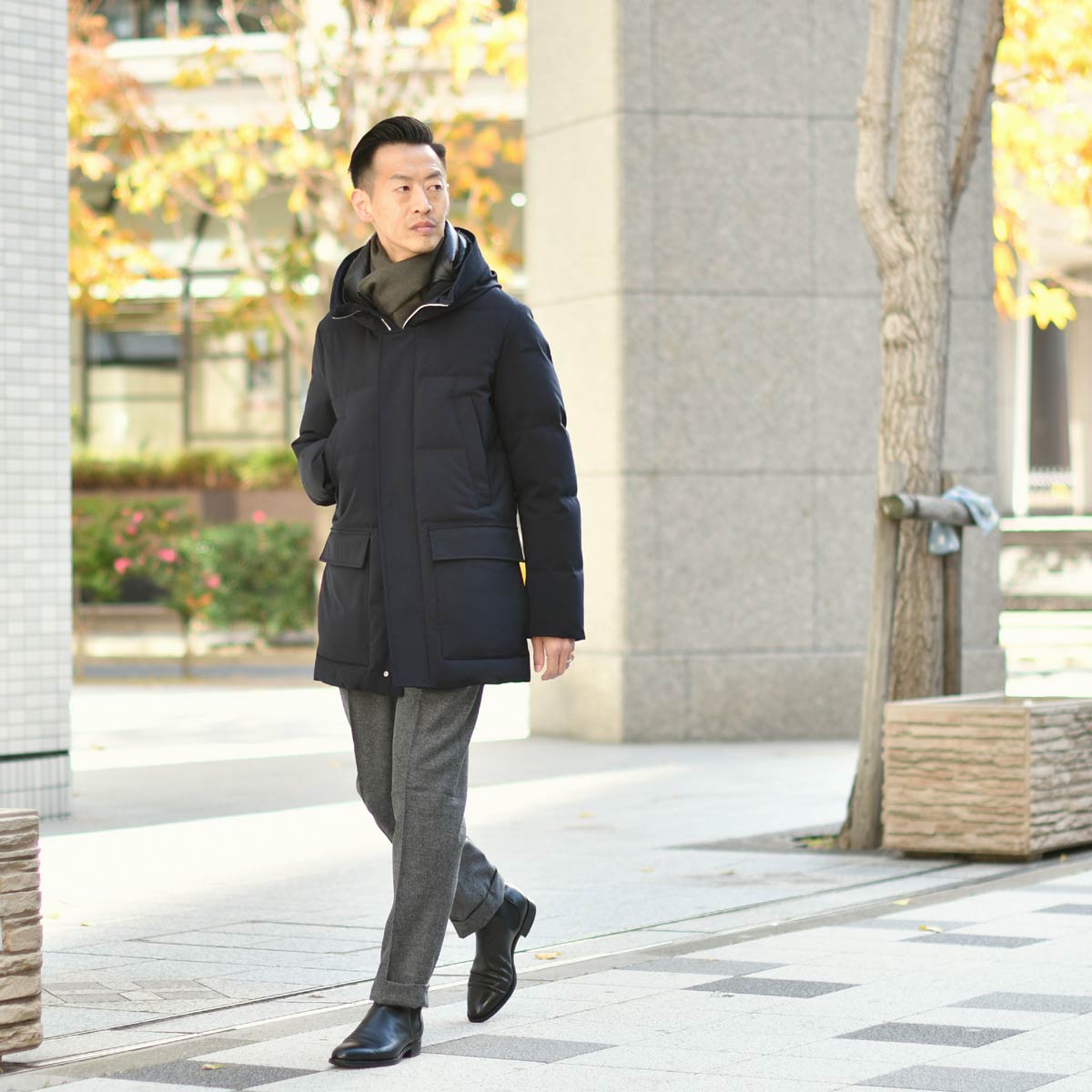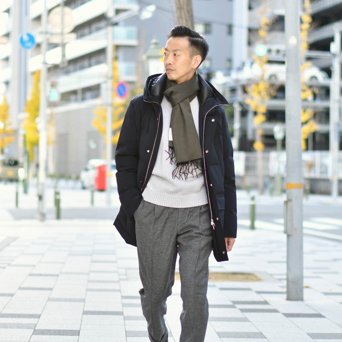 ネイビーとボルドーは相性の良い組み合わせですので、冬に必須のコートとマフラーもネイビーで揃えました。