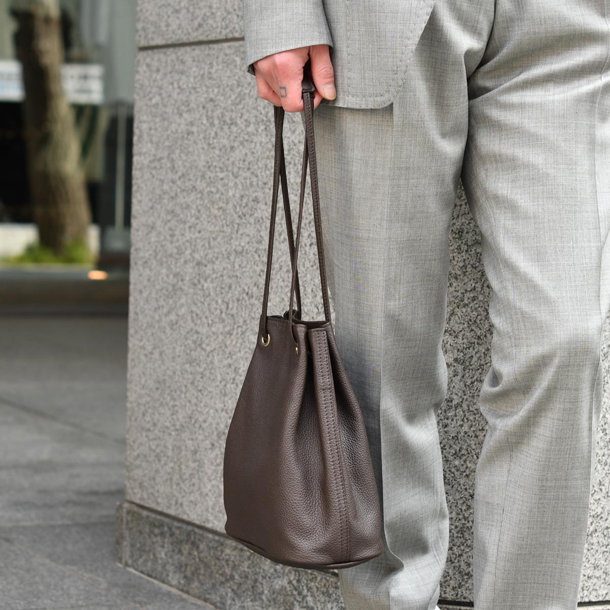 本来男らしいアイテムを柔らかなモカブラウンにすることで、