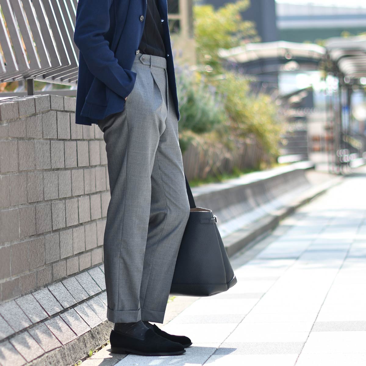 ジャケパンスタイルにおいて、ミディアムグレーのウールスラックスは、正装とも言える1本。