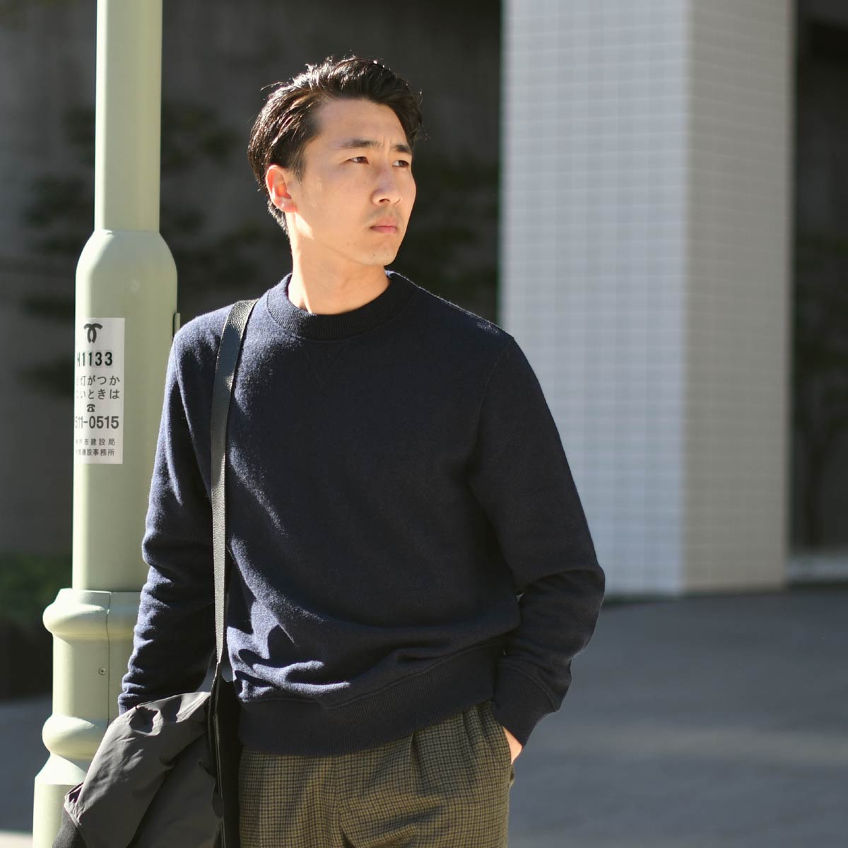 インナーには、スウェットみたいなカシミヤウールのニットを着ております。色は、グレーでなく、ネイビー。