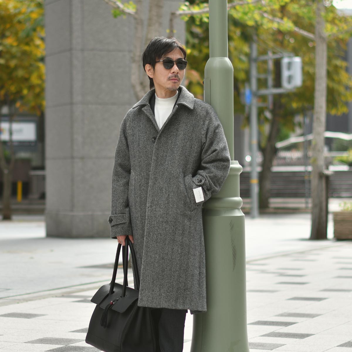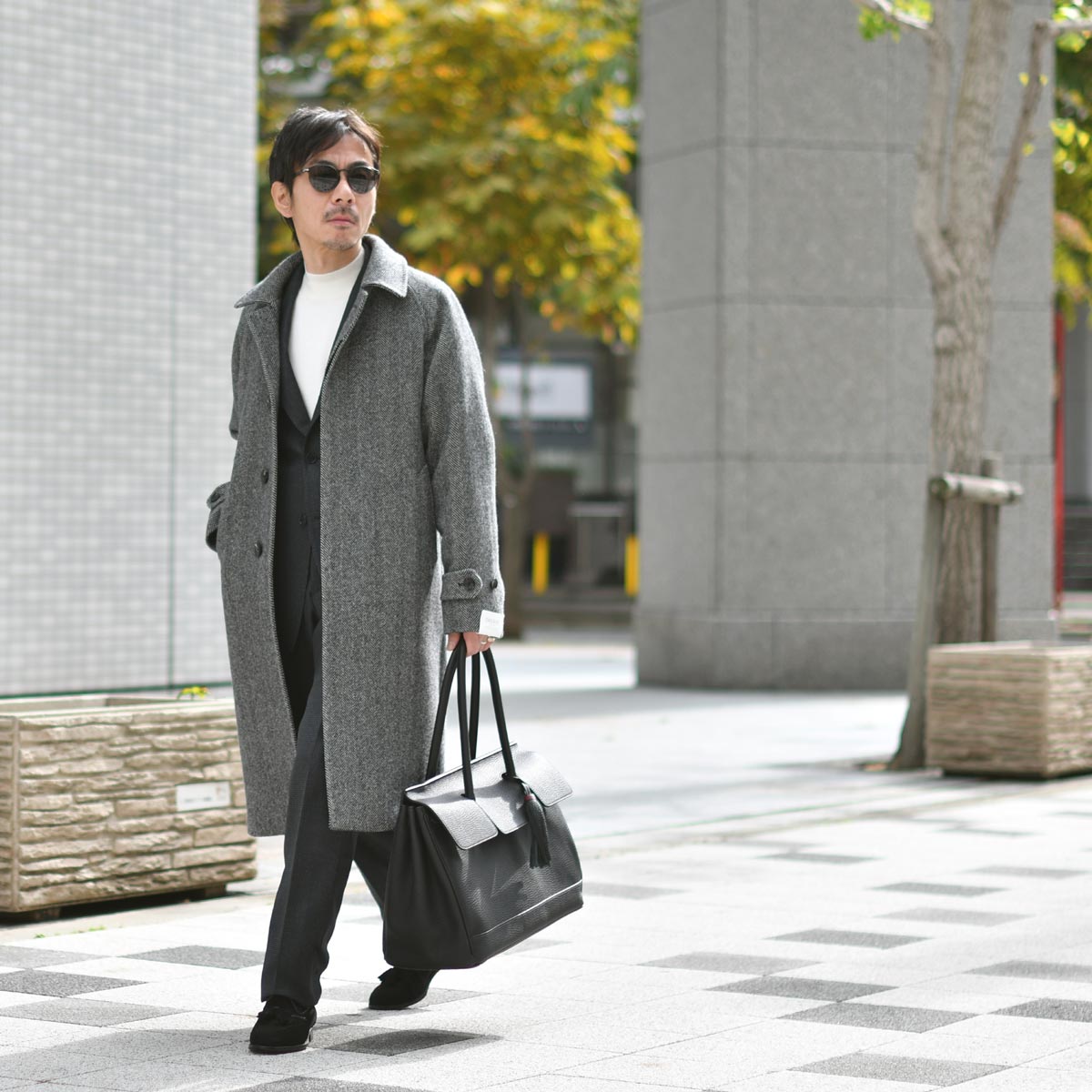 グレー見えするヘリンボーンにはモノトーンコーデがまとまりよし。