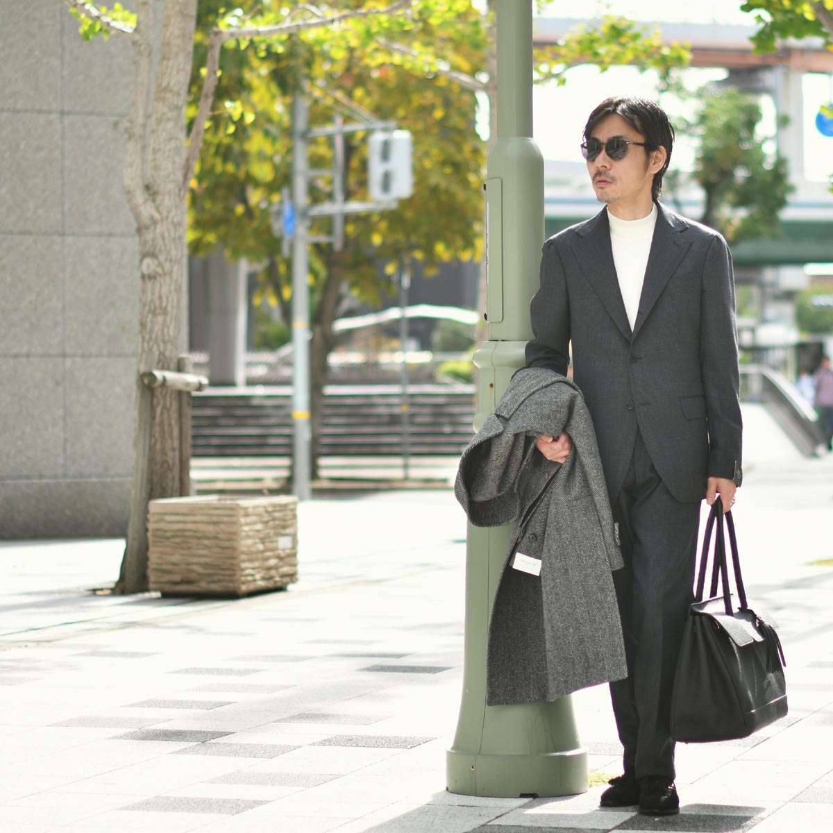 ラグランスリーブの仕立てに合わせて、クラシックなスーツをモックネックでドレスダウン。
