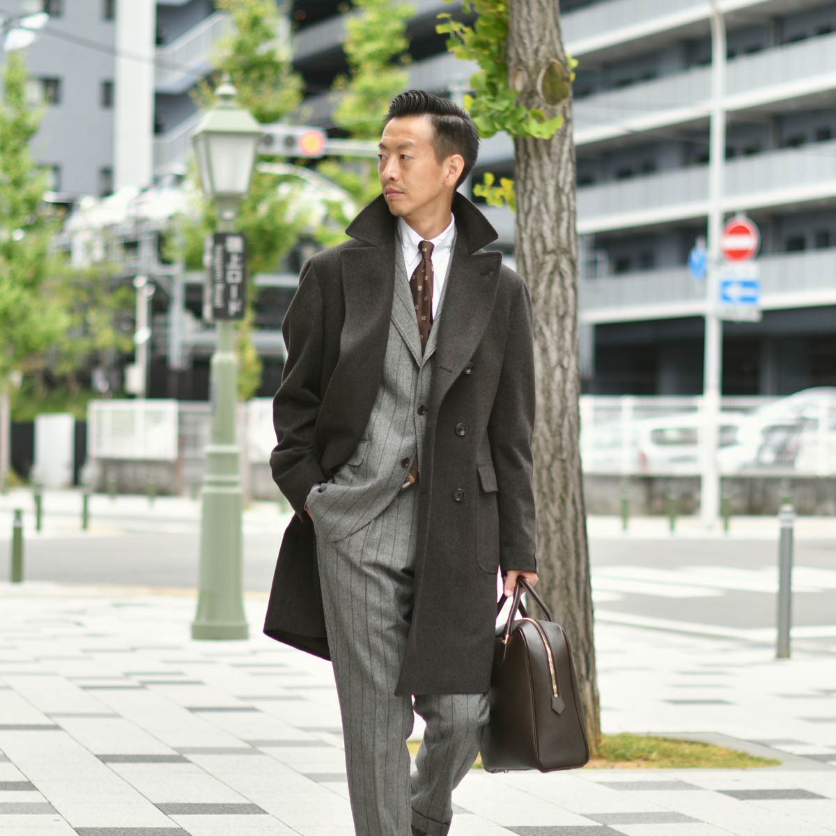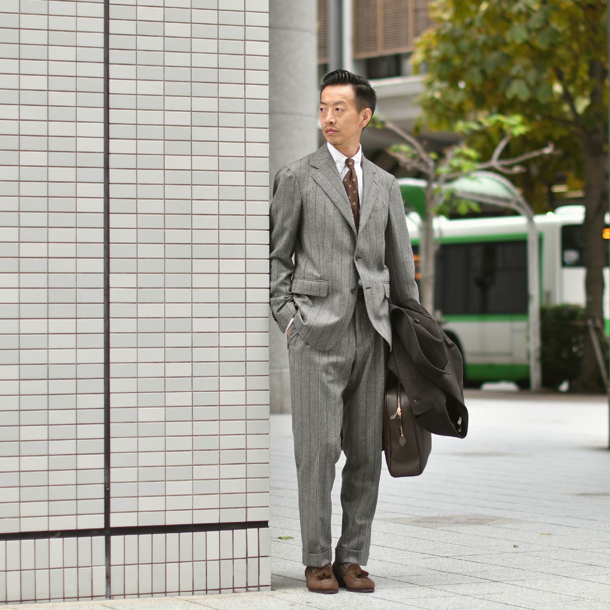 スーツはヘリンボーンにブラウンのストライプが走るビンテージ感溢れる生地。