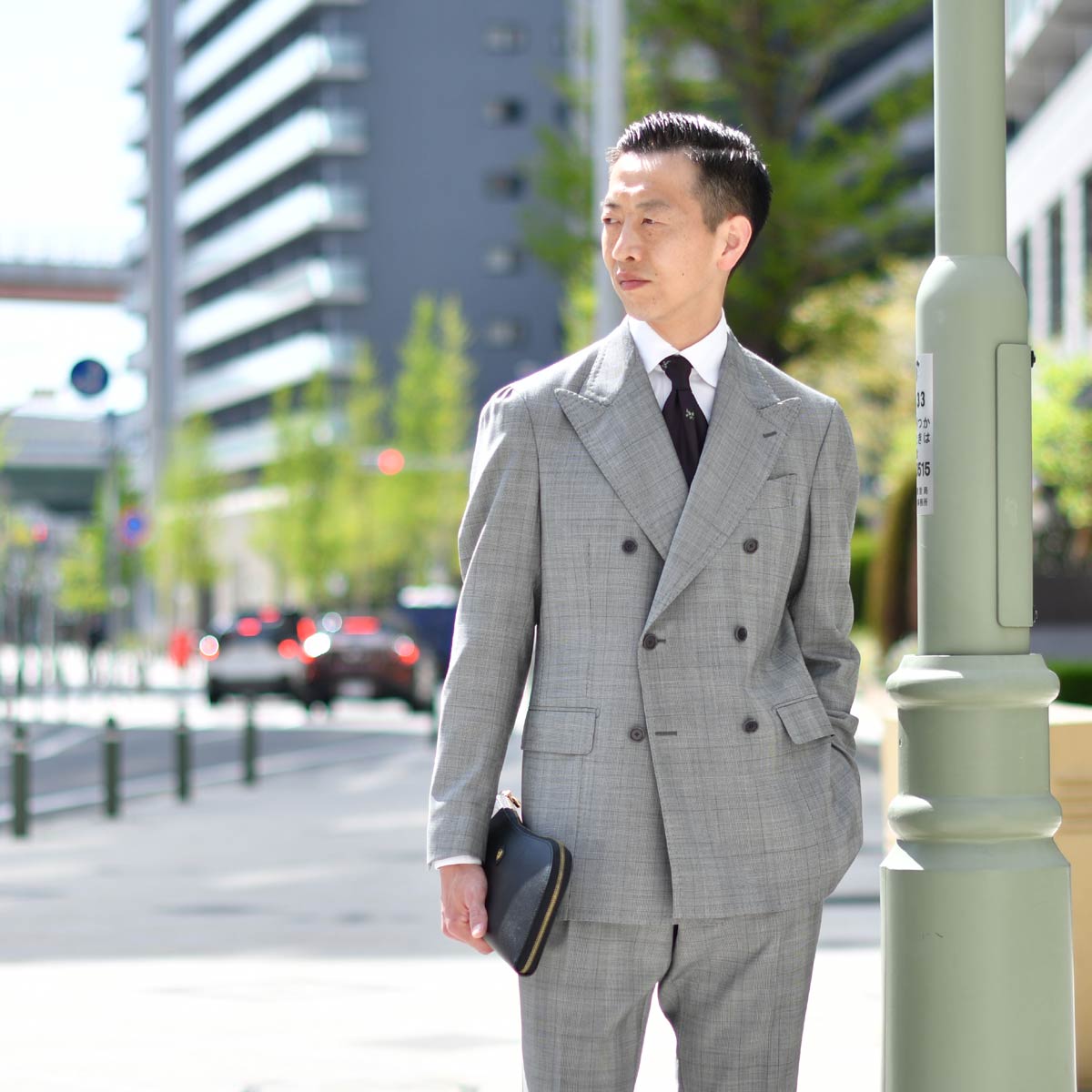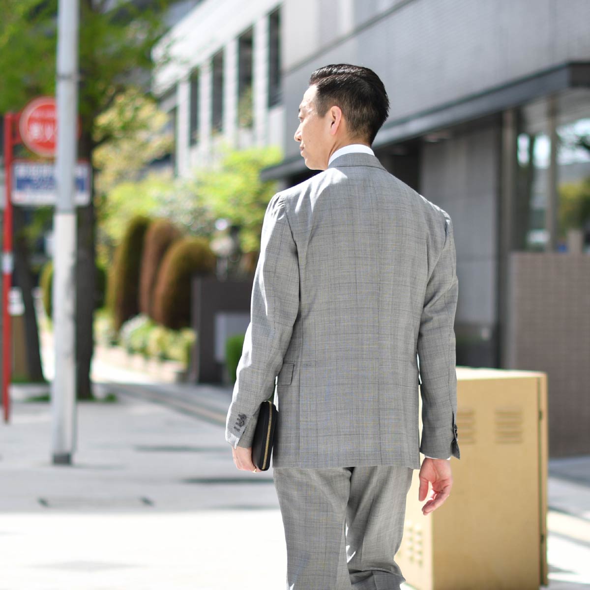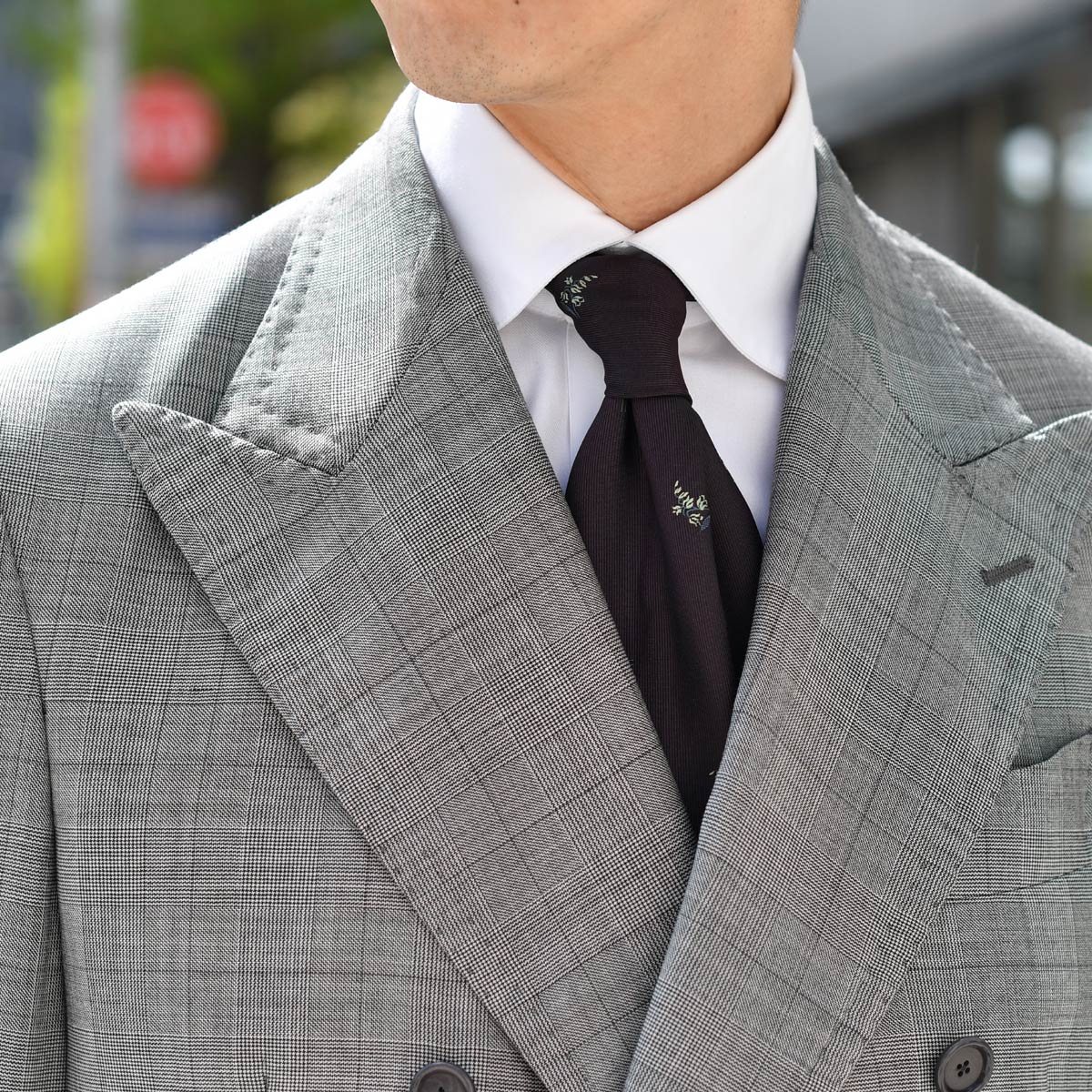 柄物=カジュアルと思われがちですが、ビジネスシーンにもぴったりで、柄の主張が控えめな今回の1着は、遠目に見ればライトグレーにも見えるほどです。