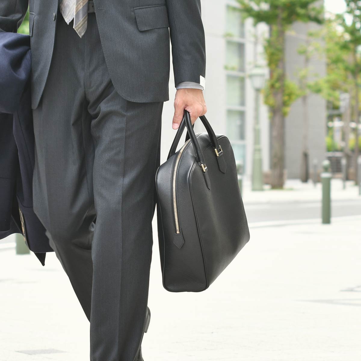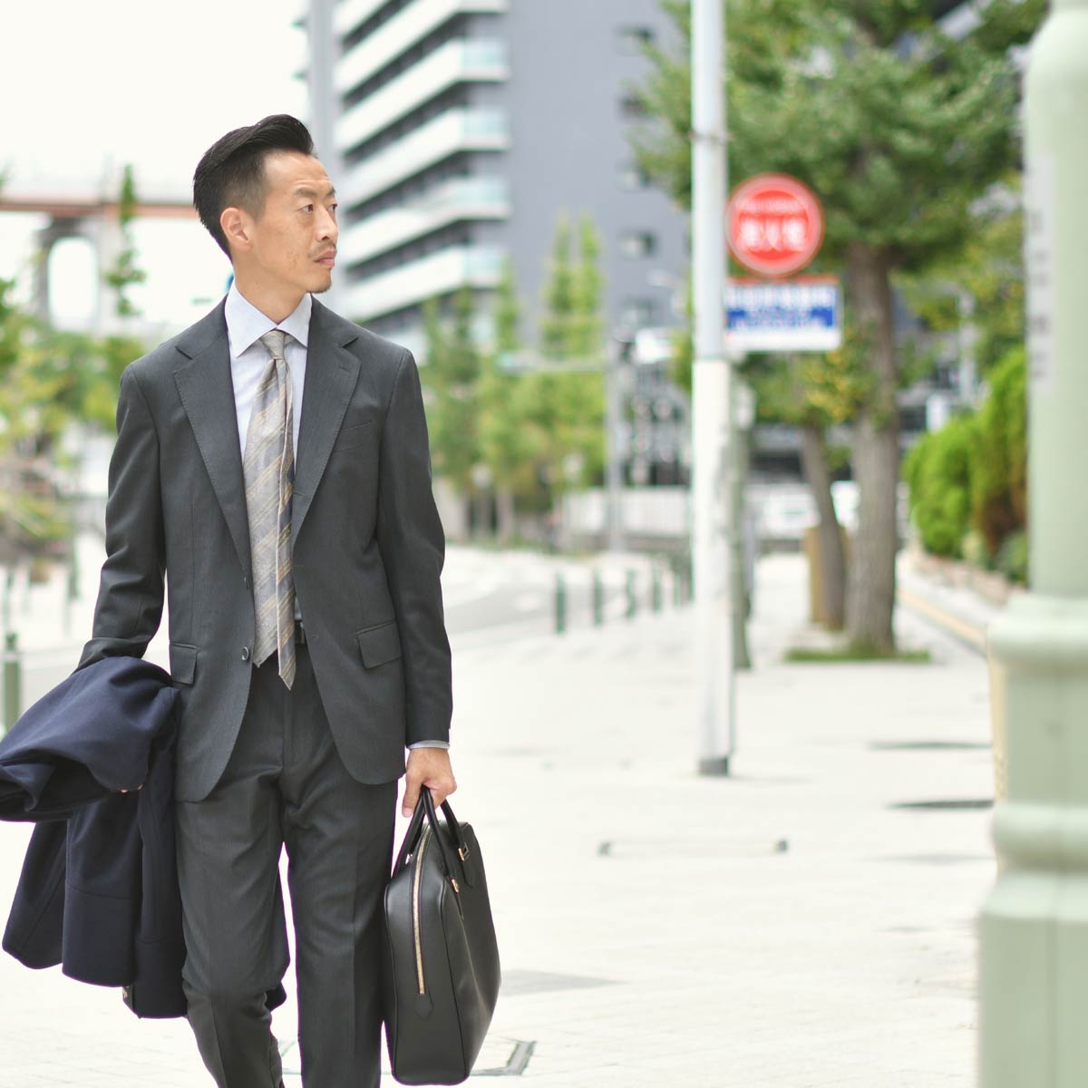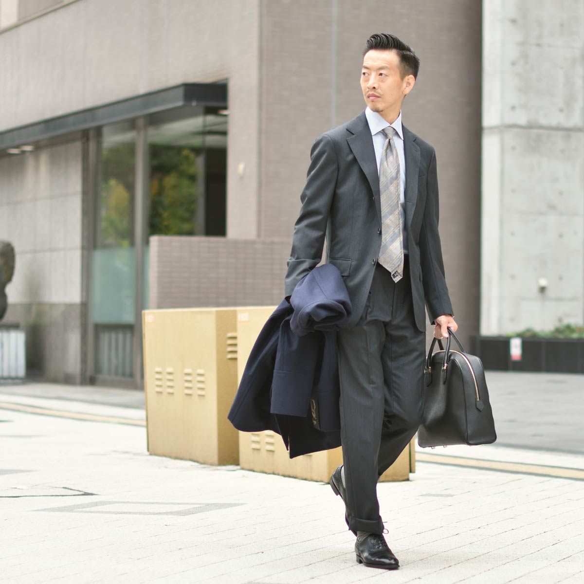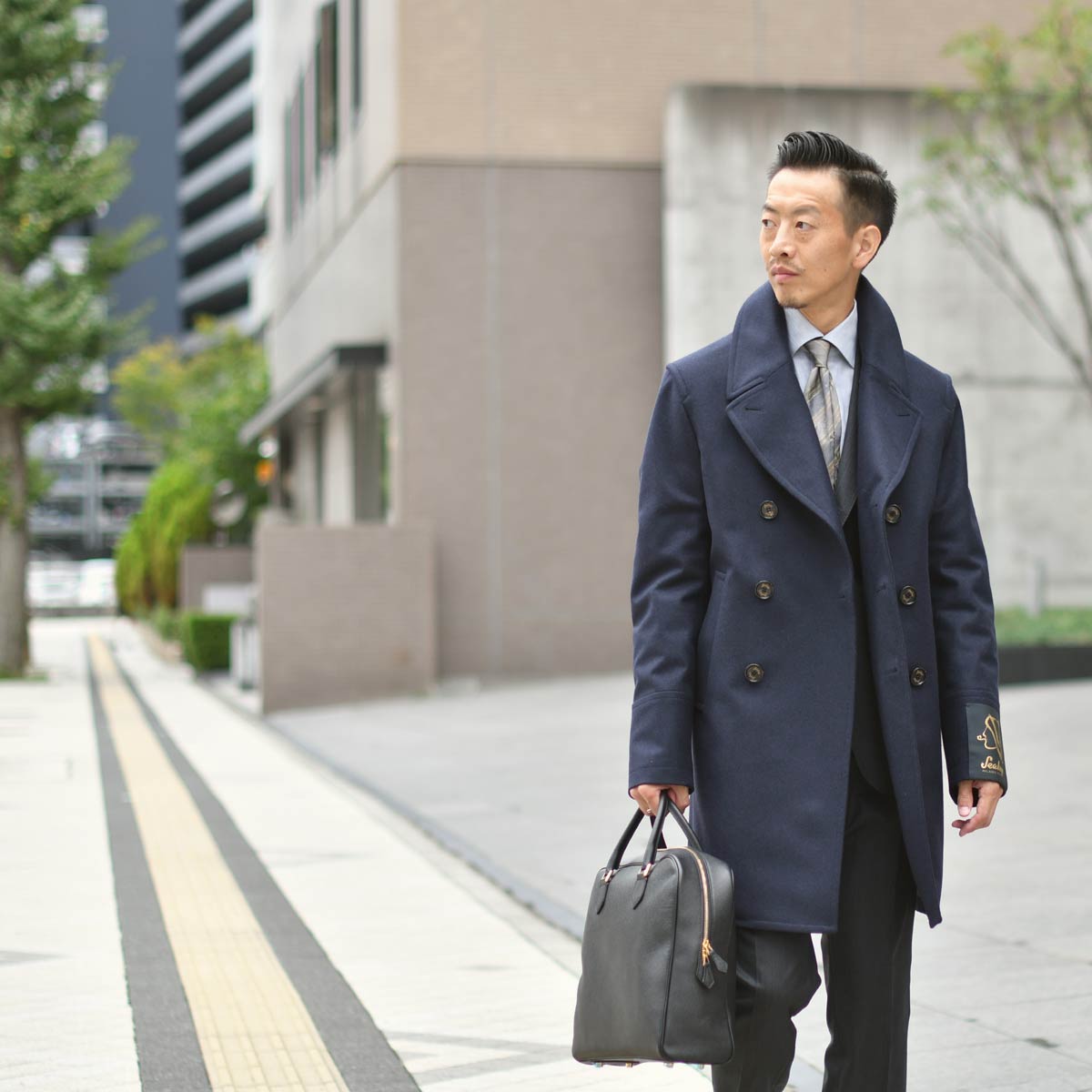 タフな雰囲気ですが、ロング丈ですので、スーツスタイルにも合わせられます。