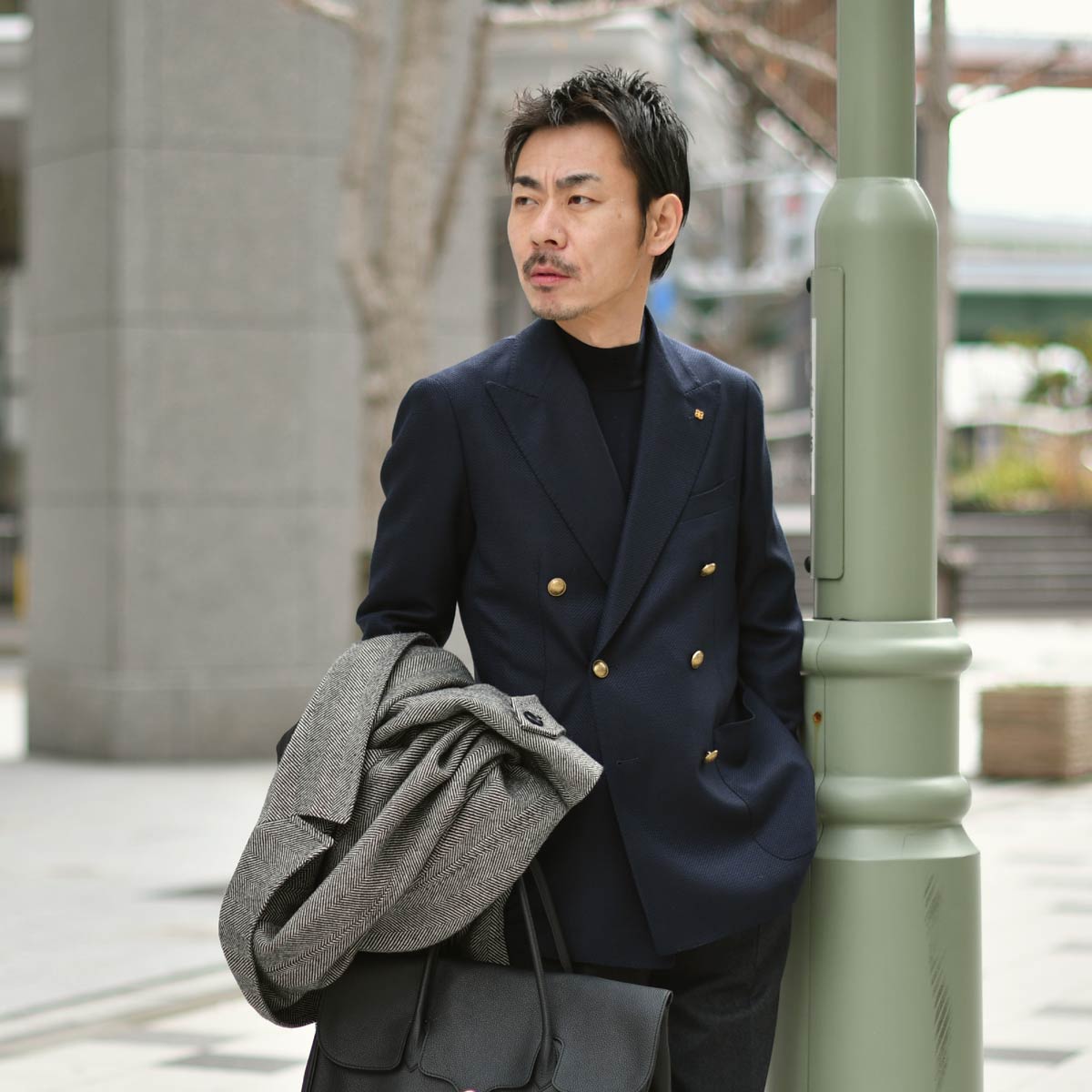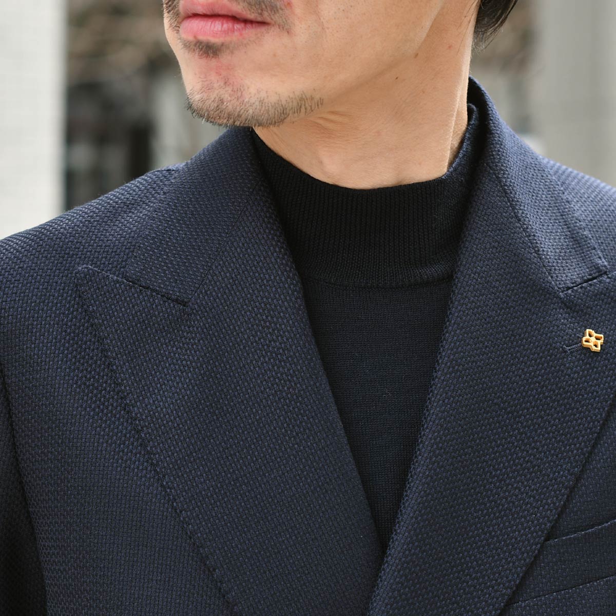 ニットも色を揃えてネイビーのモックネックをチョイス。