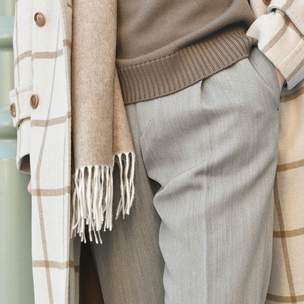 今回はあくまでもコートの引き立て役として、色馴染みの良いグレージュをセレクトしました。