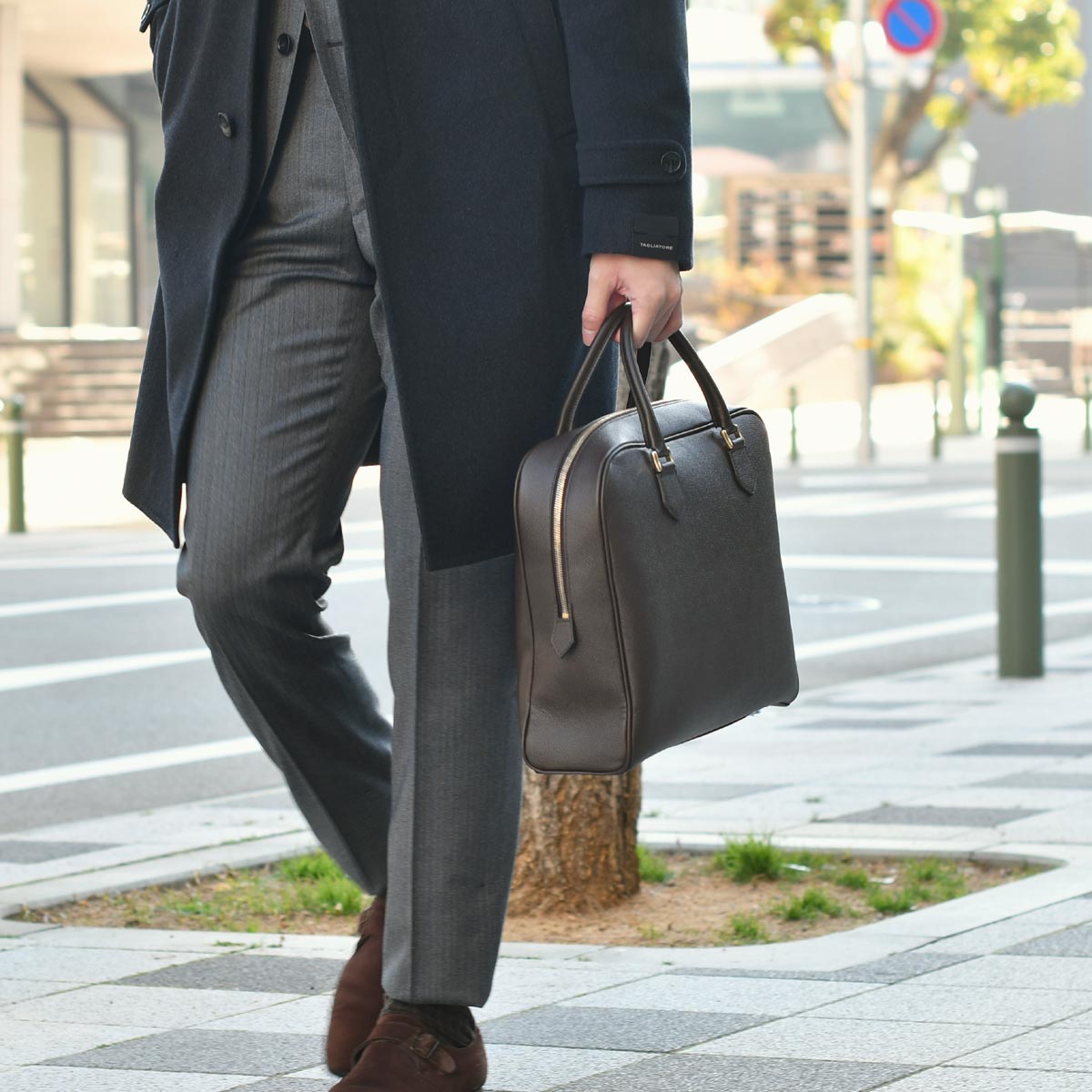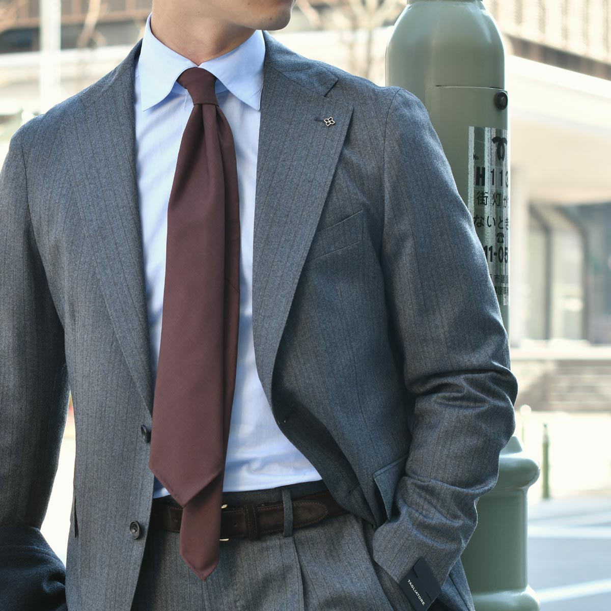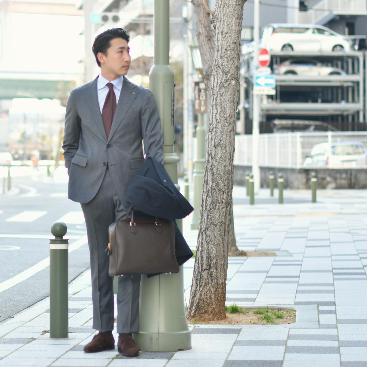 グレーとブラウンにしか出せない渋みのあるスーツスタイルです。